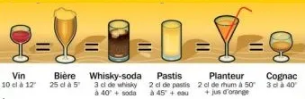 Chaque type d’alcool (vin, bière,…) ne possède pas la même contenance en alcool. En effet, pour ne pas dépasser la limite un grand verre de bière et un petit verre de whisky auront quasiment le même effet bien qu’ils aient été consommés à différentes doses. Voici une image récapitulative des équivalences entre les différents types d’alcools les plus courants :